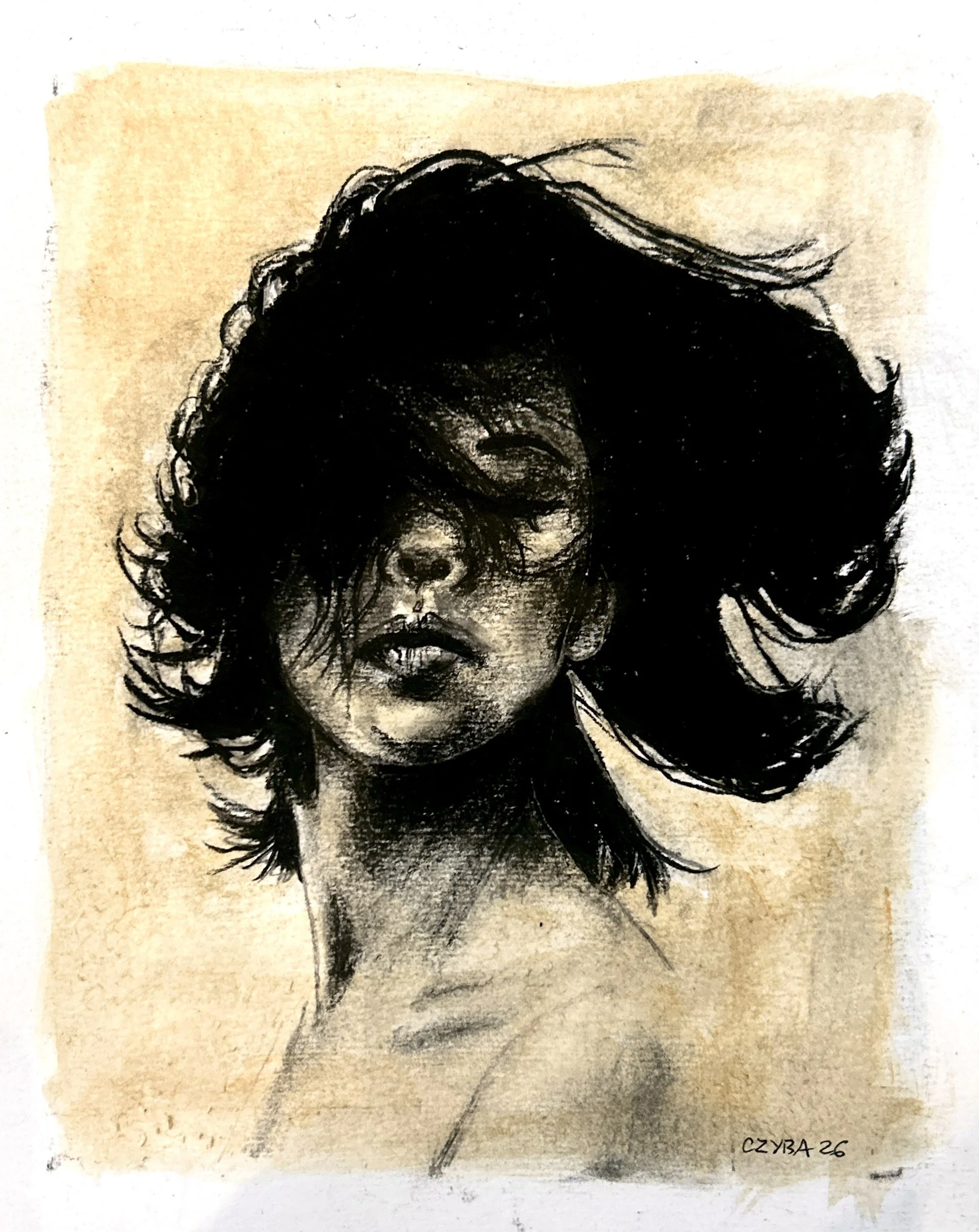 Fusain & aquarelle sur papier, 21×29 cm. 2026.
